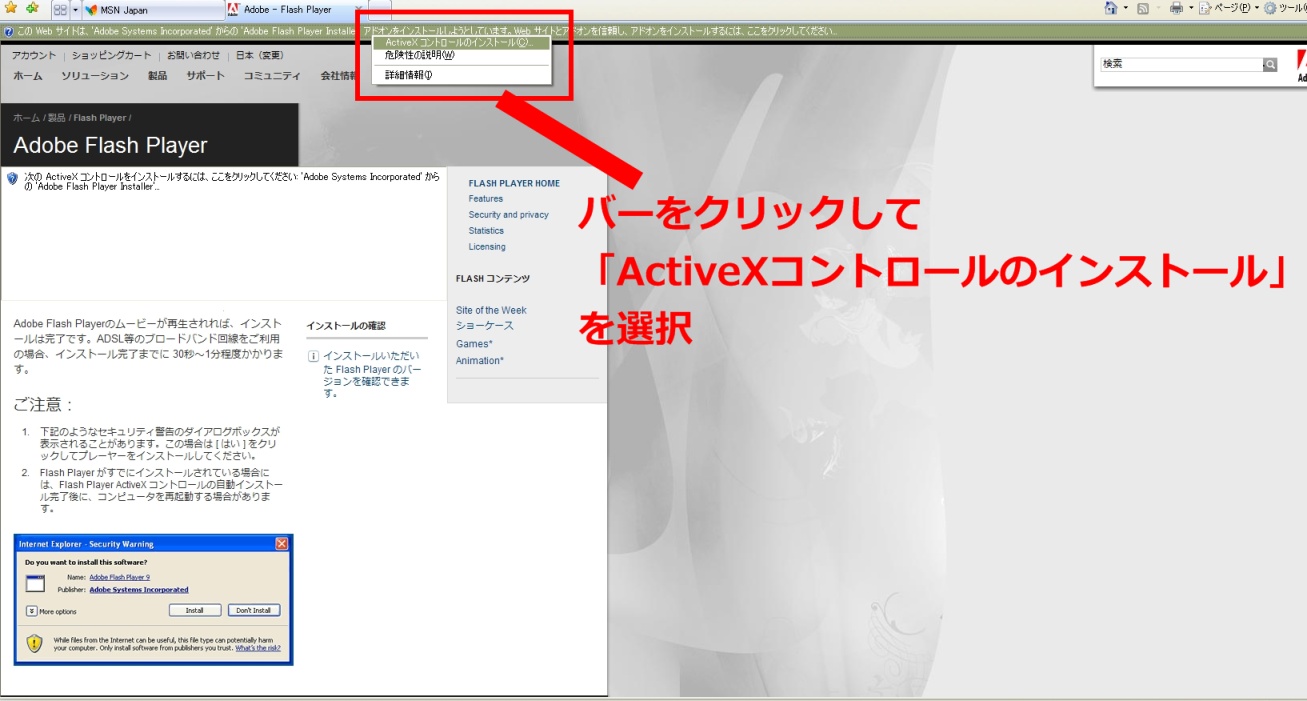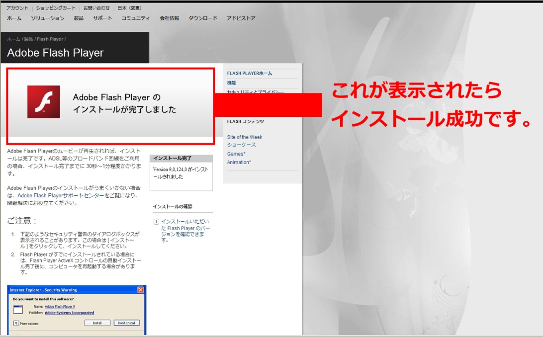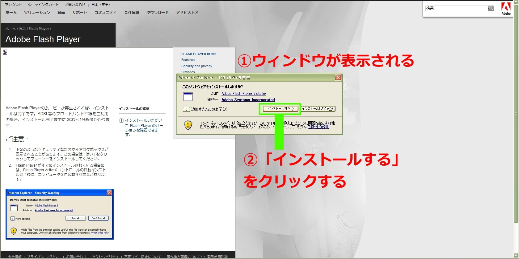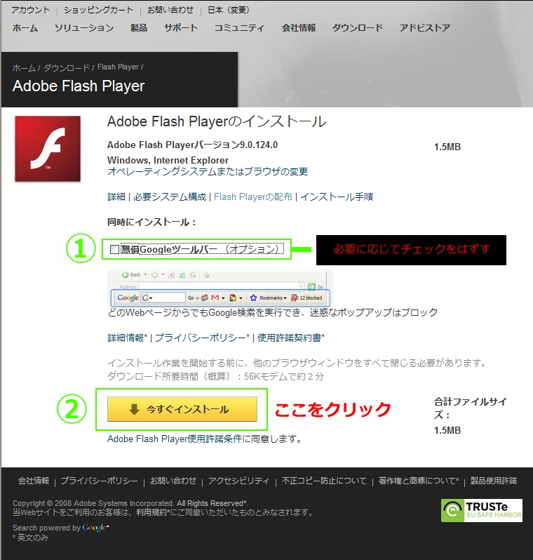 ①まず、Adobe社のホームページにある、Flashのページにアクセスします。